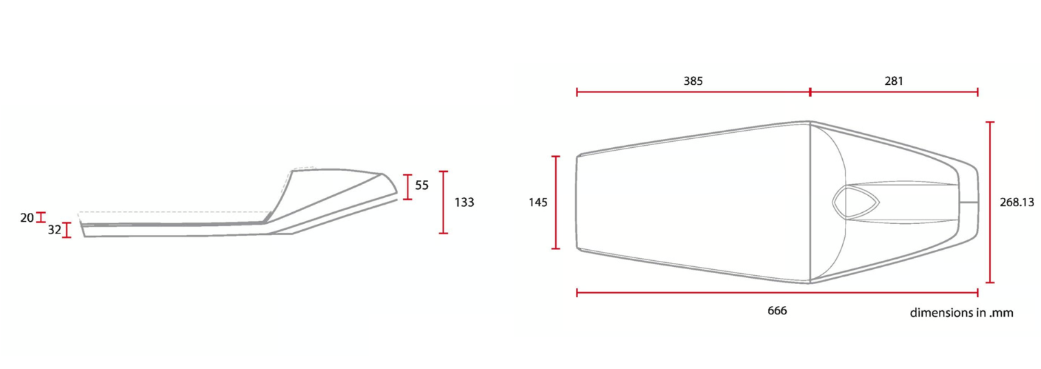 Tämä satula on hieman modernimpi café-tyylinen, ja siinä on terävämmät linjat ja kompaktimpi takaprofiili. Verhoilu antaa siistin ja hienostuneen ilmeen, ja yläosan timanttikirjailut tuovat hienovaraista kontrastia. Universaali malli niille, jotka haluavat päivitetyn version klassisesta café racer -tyylistä.