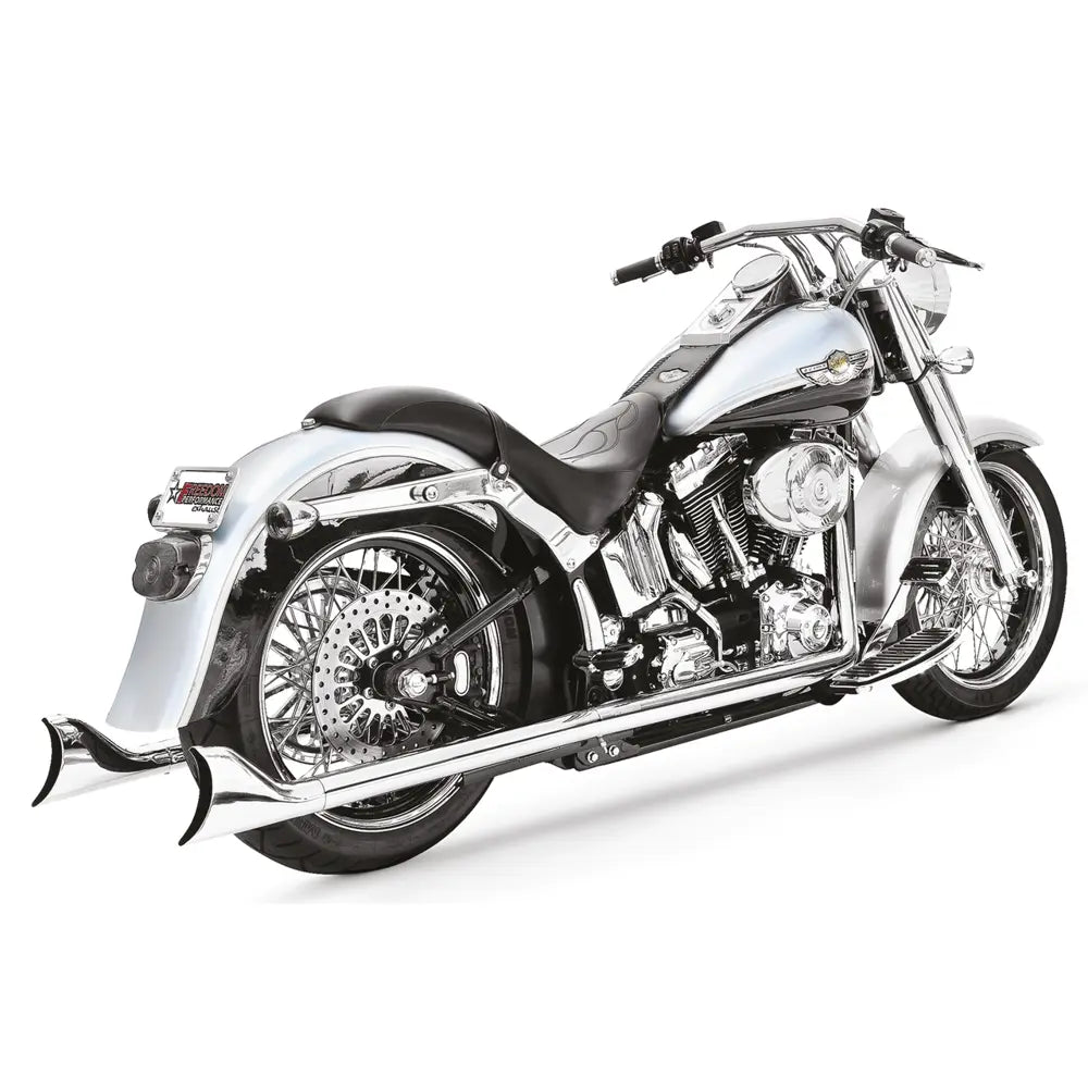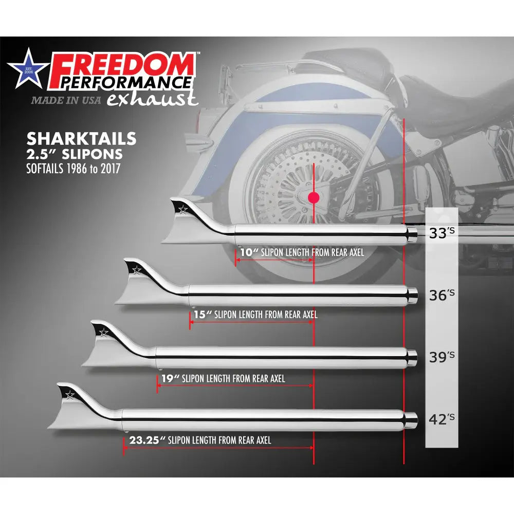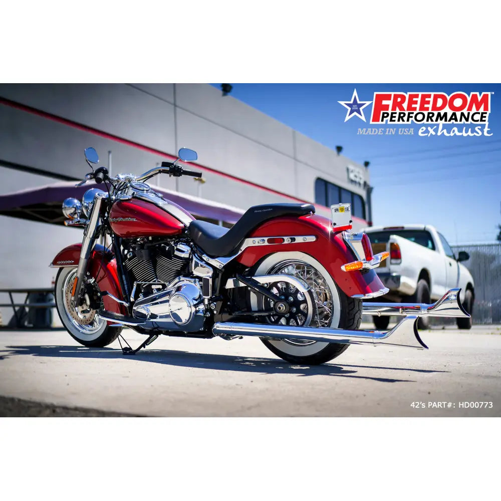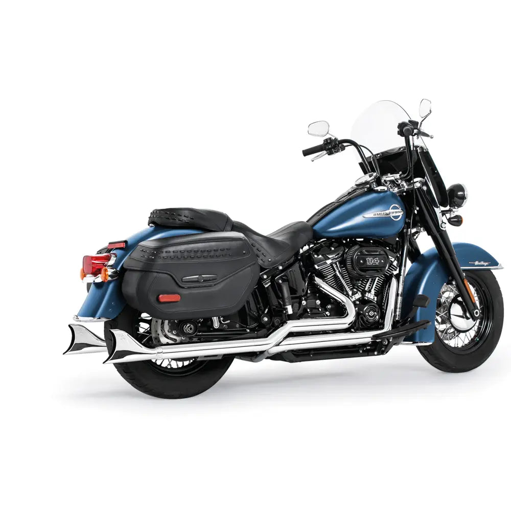 Vapauta syvä hot rod -myrinä irti käyttämällä Freedom Performance Sharktail True Dual -pakoputkella Harleyyn. Tämä järjestelmä lisää vääntöä ja hevosvoimia lyömättömällä klassisella ulkonäöllä. Samanlainen kuin klassiset Fishtail-tyyliset pakoputket.