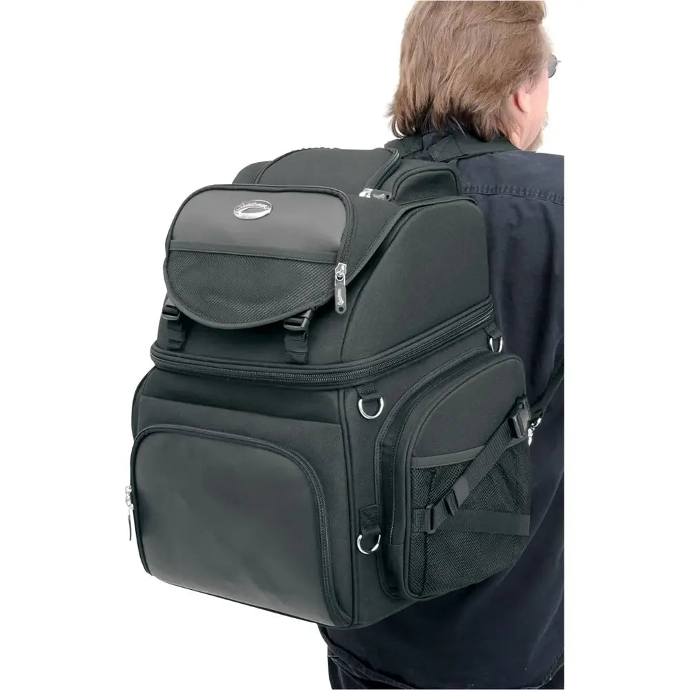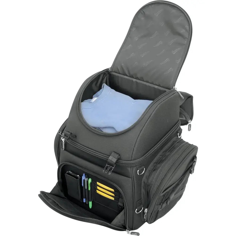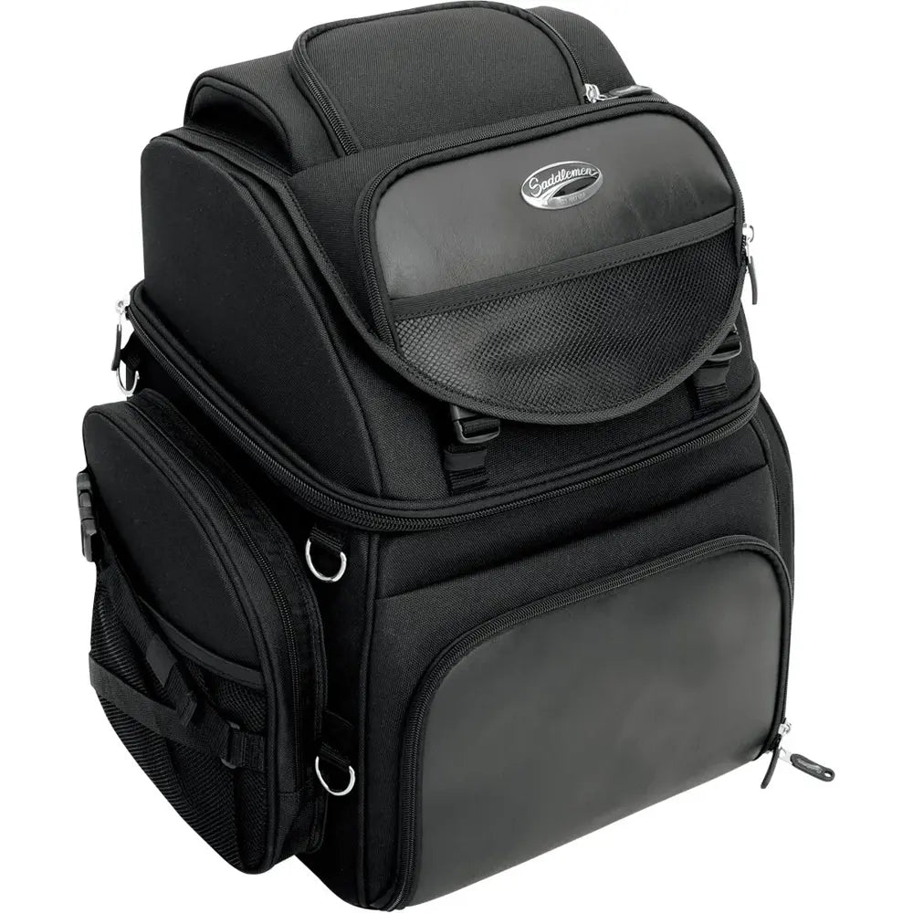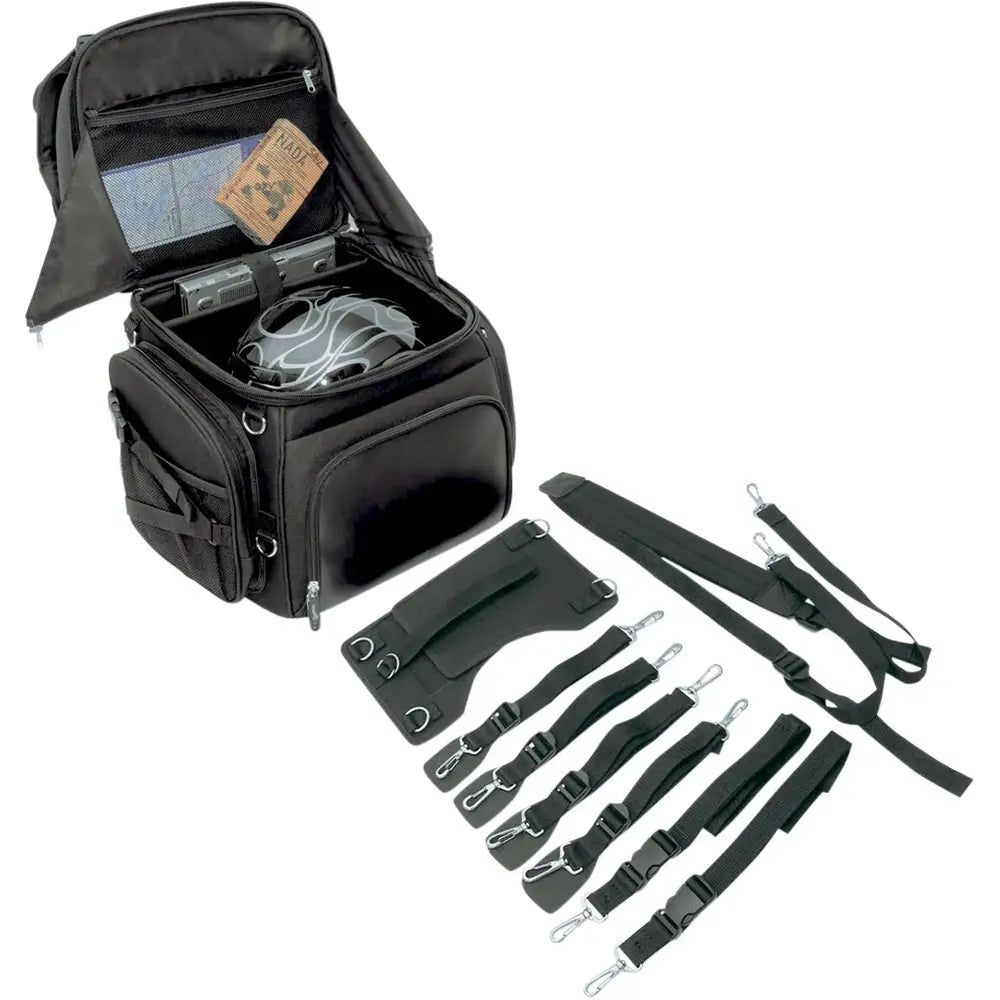 Tämä laukku on suunniteltu kiinnitettäväksi monenlaisiin kokoonpanoihin, riippumatta siitä, kiinnitätkö sen istuimeen, tavaratelineeseen tai sissy bar -telineeseen mukana toimitettujen kiinnikkeiden avulla. Se säilyttää muotonsa vahvistetun rakenteensa ansiosta, ja SaddleTuff™-materiaalin ja nahkaa muistuttavien paneelien yhdistelmä tekee siitä kestävän sääolosuhteita vastaan. Tilavien lokeroiden, laajennettavien taskujen ja jopa kannettavan tietokoneen lokeron ansiosta se sopii sekä pitkille matkoille että päivittäiseen ajeluun.